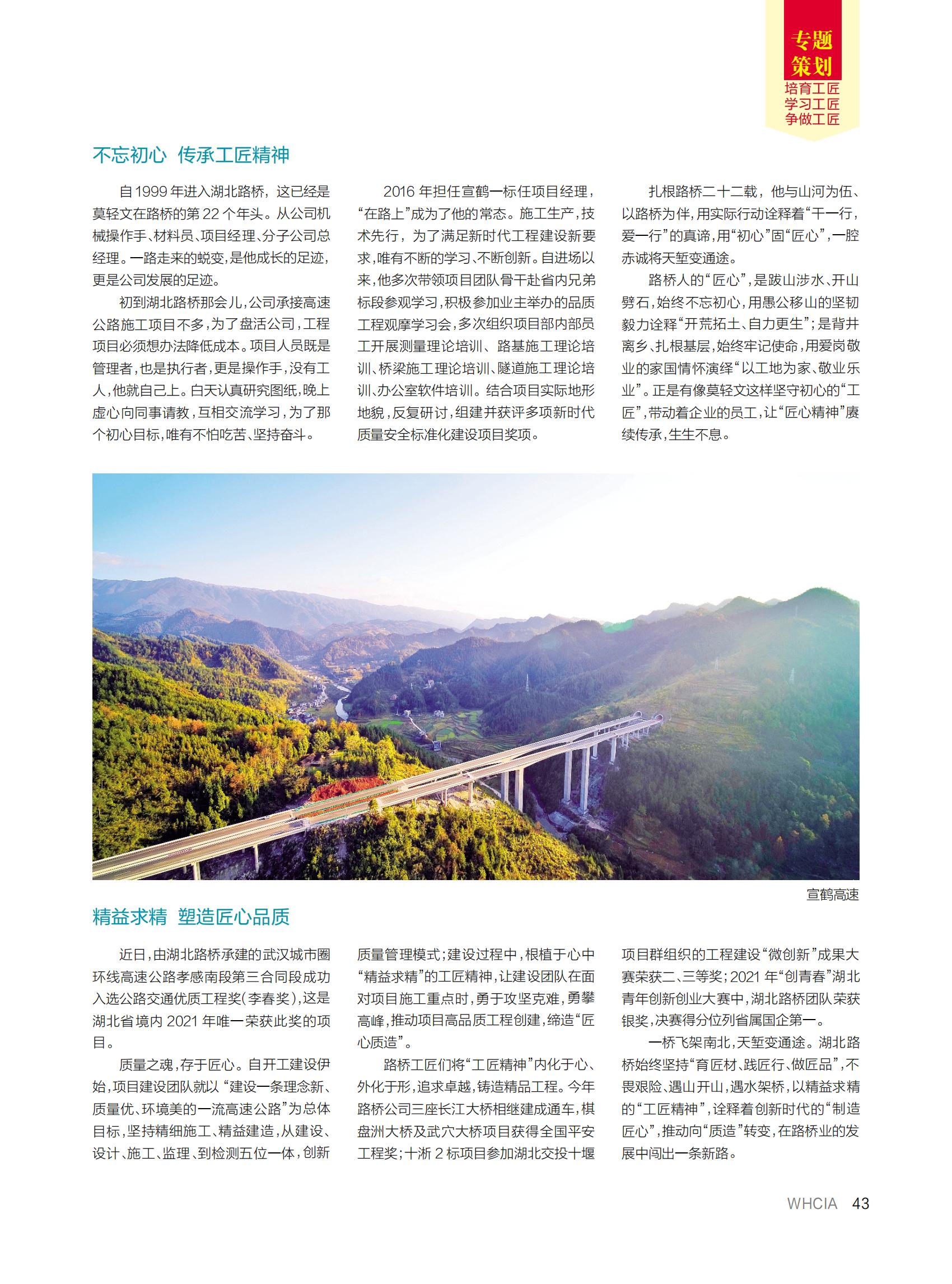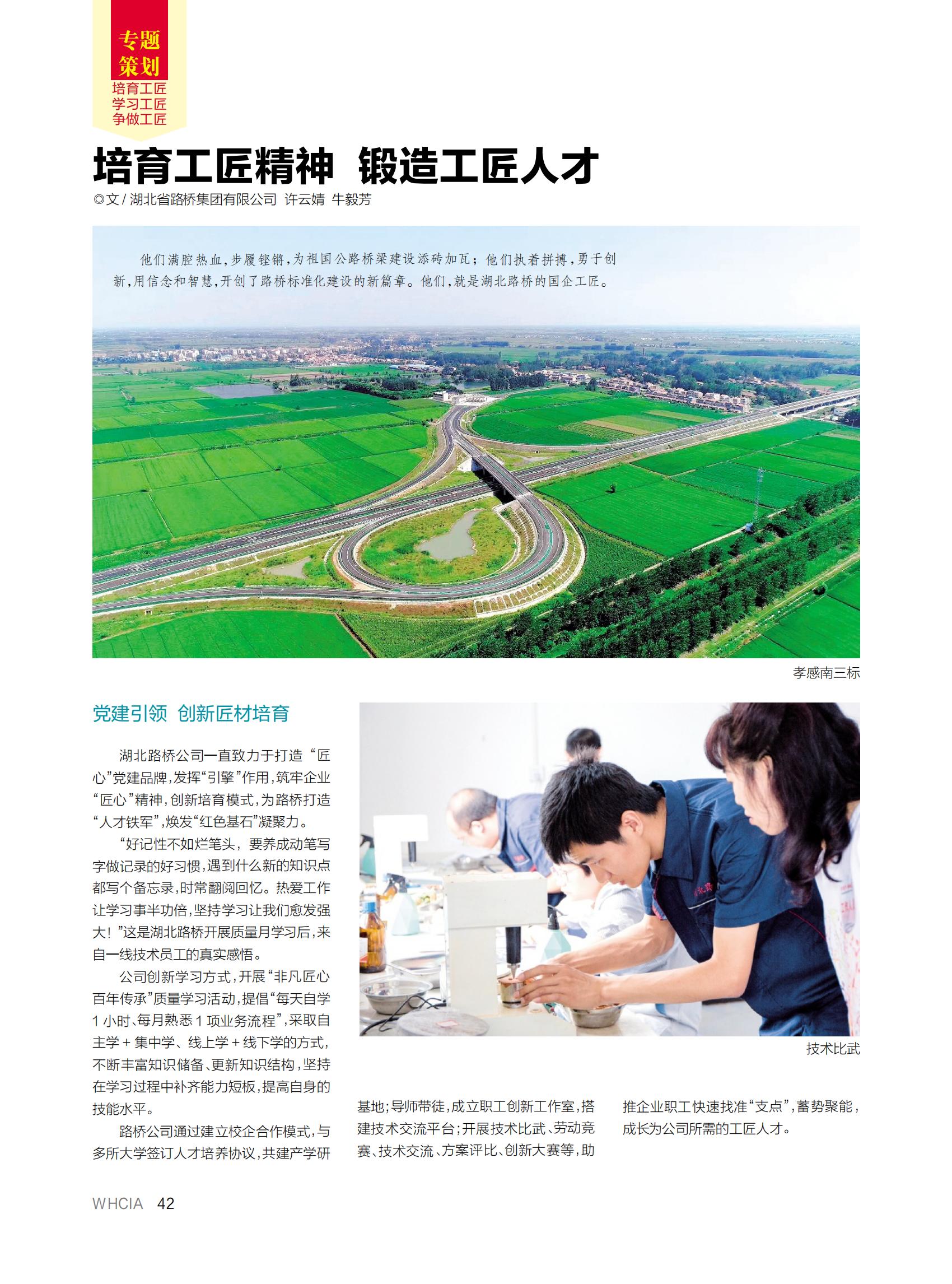 近日,湖北路橋撰寫(xiě)的《培育工匠精神 鍛造工匠人才》一文,登上武漢建筑業(yè)協(xié)會(huì)主辦的《武漢建筑業(yè)》雜志“工匠精神”專題策劃版,以下為全文: