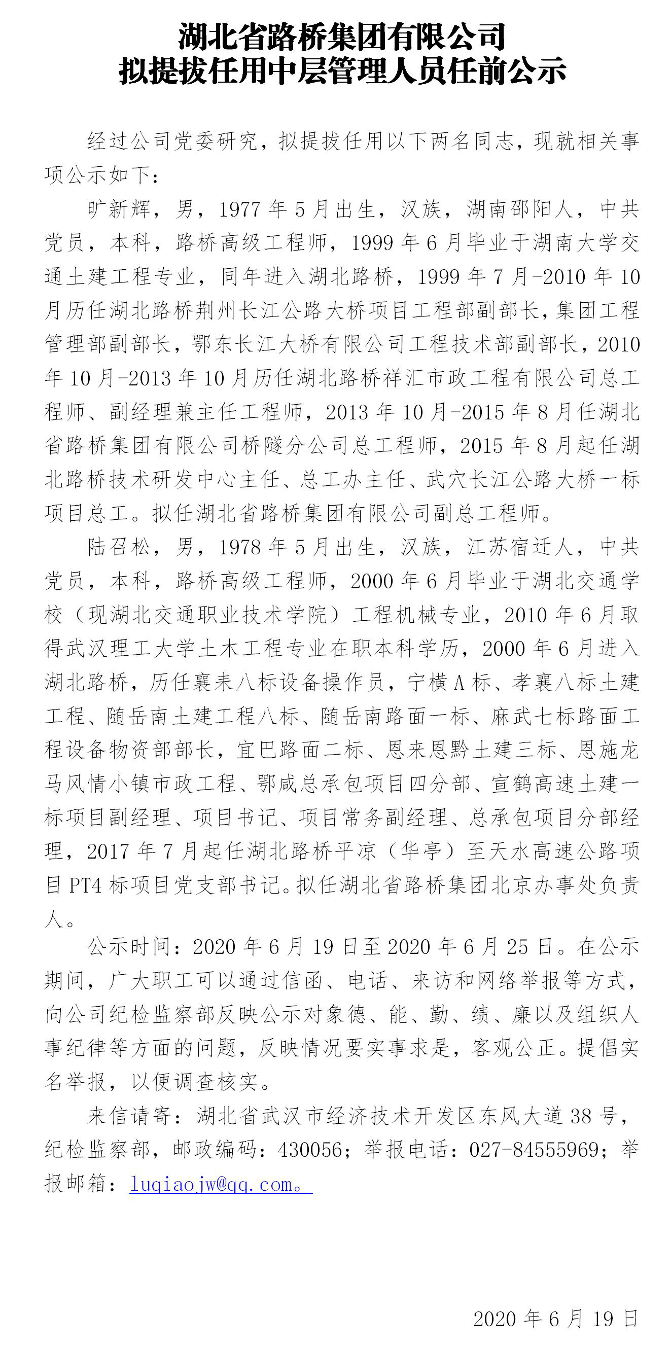 湖北省路橋集團有限公司擬提拔任用中層管理人員任前公示
