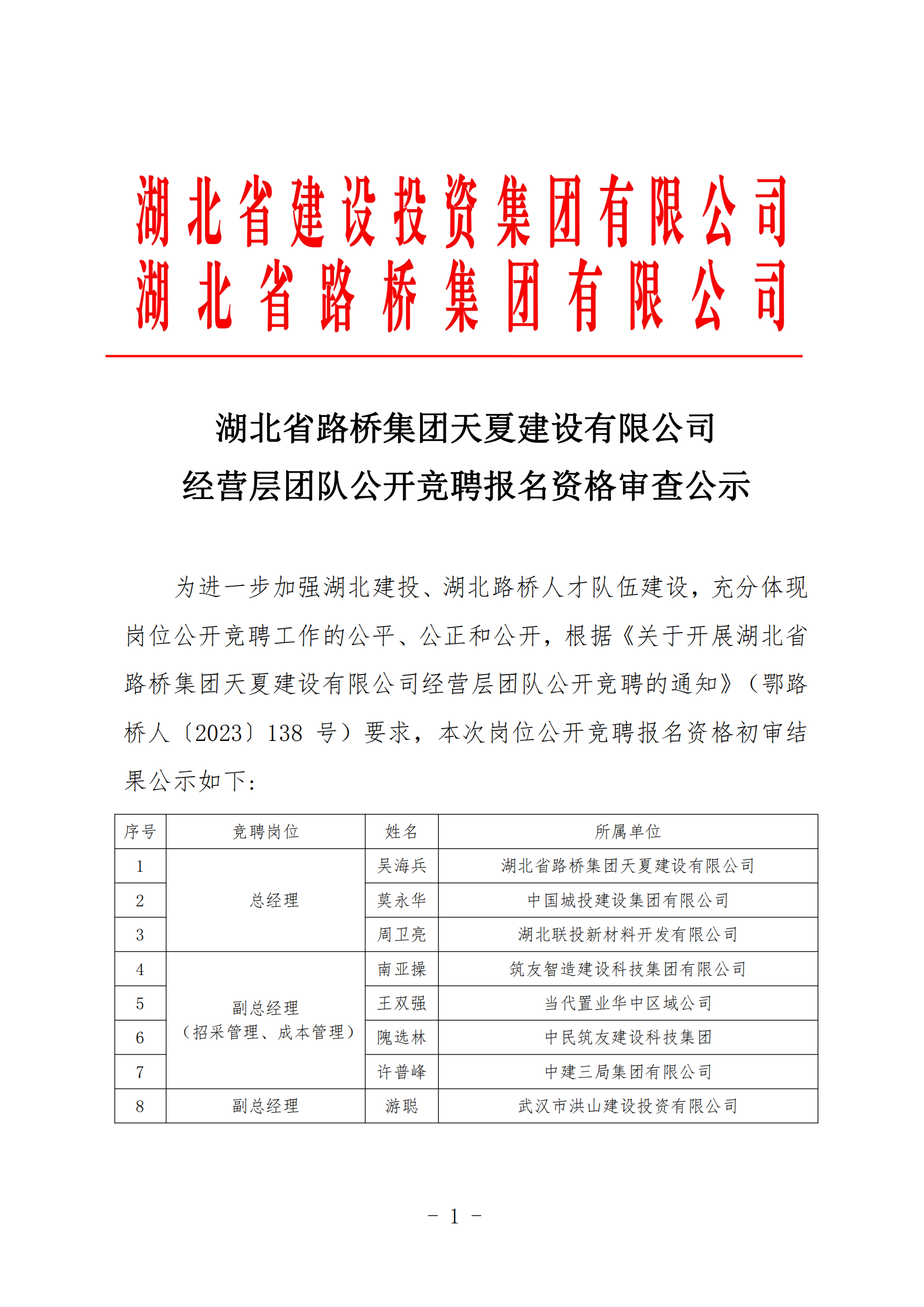 湖北省路橋集團(tuán)天夏建設(shè)有限公司經(jīng)營層團(tuán)隊公開競聘報名資格審查公示