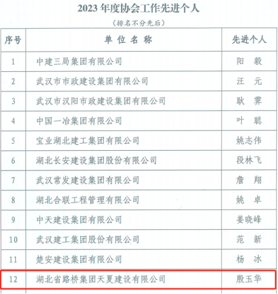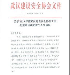初心如磐守安全,砥礪奮進(jìn)譜新篇。近日,武漢建設(shè)安全協(xié)會就2023年建筑行業(yè)安全生產(chǎn)方面評選了一批先進(jìn)單位和先進(jìn)個人,湖北路橋天夏公司榮獲“2023年度協(xié)會工作先進(jìn)單位”稱號,天夏公司副總經(jīng)理殷玉華、安全總監(jiān)付建國榮獲“2023年度協(xié)會工作先進(jìn)個人”稱號。