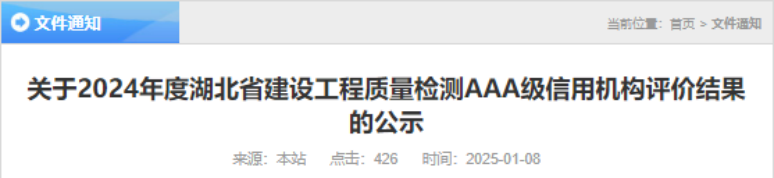 1月8日,湖北省建設(shè)工程質(zhì)量安全協(xié)會(huì)發(fā)布了2024年度湖北省建設(shè)工程質(zhì)量檢測(cè)AAA級(jí)信用機(jī)構(gòu)評(píng)價(jià)結(jié)果,聯(lián)投湖北路橋瑞達(dá)科研檢測(cè)公司憑借優(yōu)異的誠信建設(shè)和信用管理能力,榮獲最高級(jí)“AAA級(jí)”信用機(jī)構(gòu)評(píng)價(jià)。