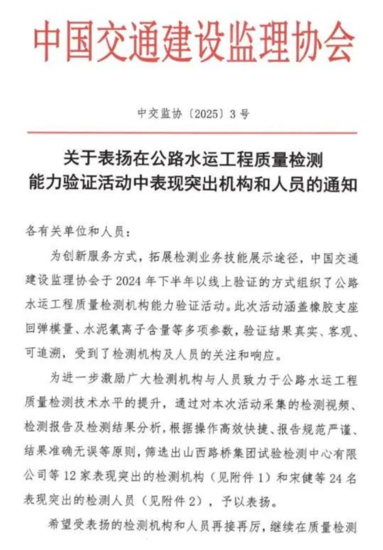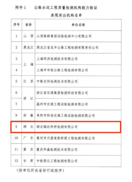 1月9日,中國交通建設(shè)監(jiān)理協(xié)會(huì)發(fā)布表彰通知,聯(lián)投湖北路橋瑞達(dá)科研檢測(cè)公司成功蟬聯(lián)第二屆公路水運(yùn)工程質(zhì)量檢測(cè)能力驗(yàn)證“表現(xiàn)突出機(jī)構(gòu)”榮譽(yù)。成為全省唯一一家連續(xù)兩屆獲此榮譽(yù)的檢測(cè)機(jī)構(gòu)。
