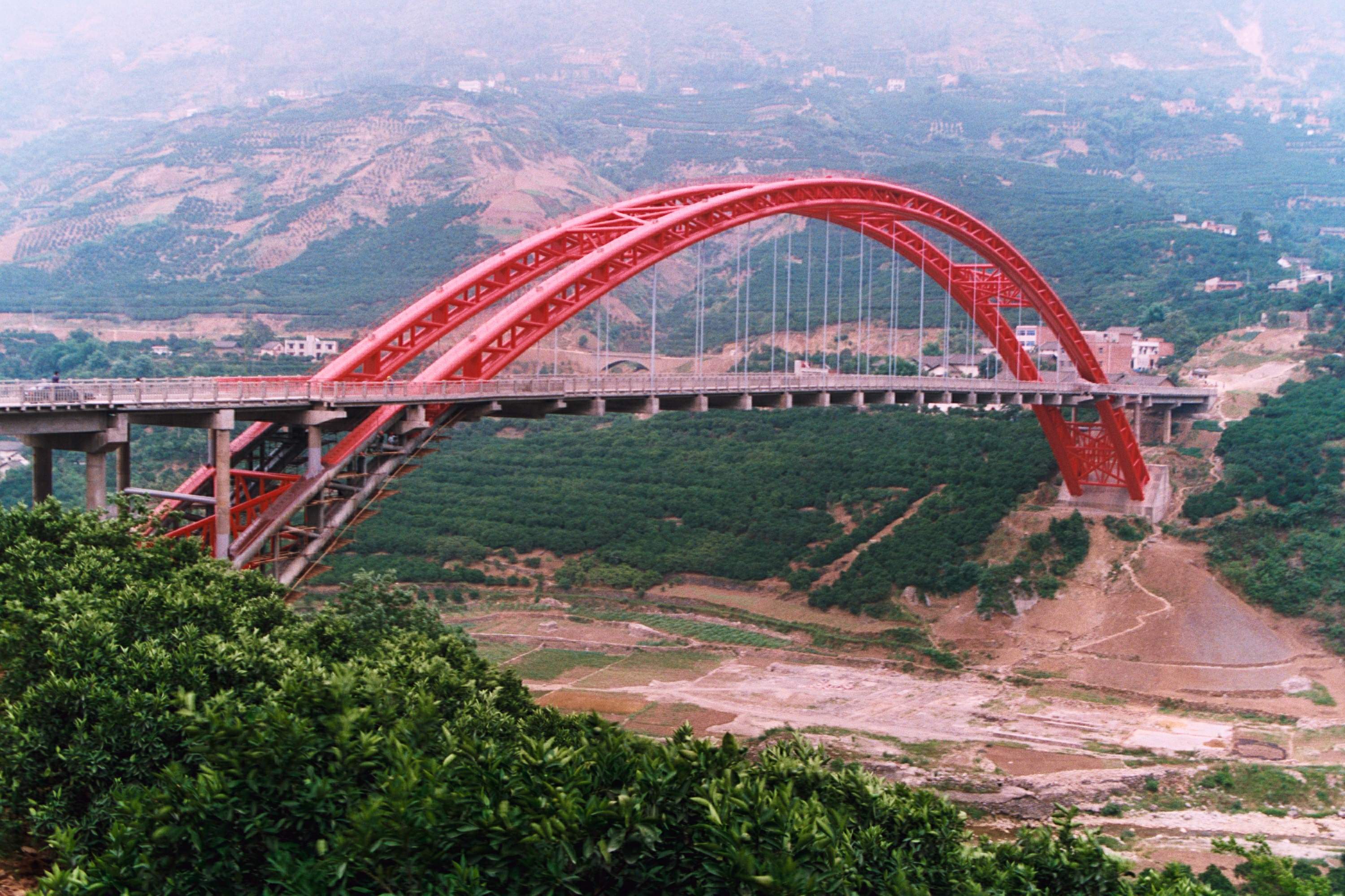 秭歸龍?zhí)逗哟髽蛭挥谥闹袊毘戎l(xiāng)----湖北秭歸縣腹地,主跨為208米的特大跨徑中承式鋼管混凝土拱橋,該橋在國內(nèi)首次采用“大跨徑鋼管砼拱橋纜索吊裝塔架扣架一體化施工,獲湖北省科技進步二等獎,于2000年建成。