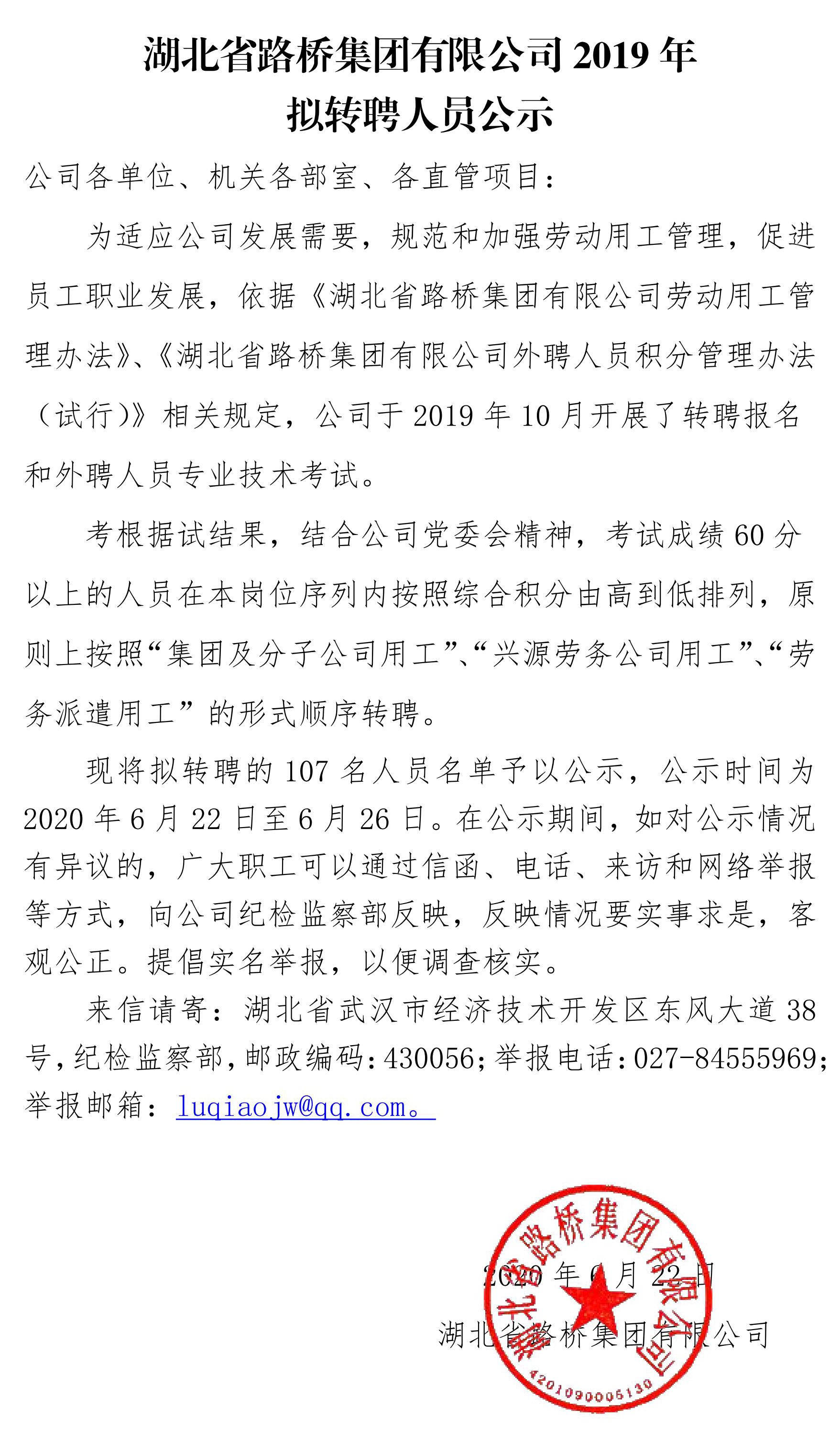 湖北省路橋集團(tuán)有限公司2019年擬轉(zhuǎn)聘人員公示
