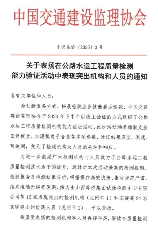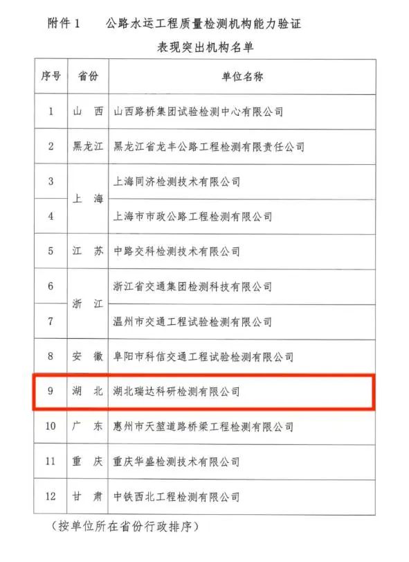 1月9日,中國交通建設(shè)監(jiān)理協(xié)會發(fā)布表彰通知,瑞達科研檢測公司成功蟬聯(lián)第二屆公路水運工程質(zhì)量檢測能力驗證“表現(xiàn)突出機構(gòu)” 榮譽,是全省唯一一家連續(xù)兩屆獲此榮譽的檢測機構(gòu)。