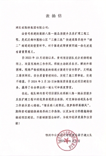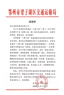 近日,湖北路橋高新八路一期品質(zhì)提升及改擴建工程項目部收到鄂州市梁子湖區(qū)交通運輸局、鄂州市公安局交通管理局梁子湖大隊的感謝信及表揚信,對高新八路一期項目保質(zhì)保量完成建設(shè)任務(wù),如期實現(xiàn)全線貫通給予高度肯定。