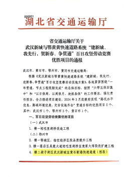 近日,湖北省交通運輸廳發(fā)布兩則關于武漢新城與鄂黃黃快速道路系統(tǒng)建設的通報,由湖北路橋承建的吳楚大道項目、高新八路一期項目分別獲評年度“紅旗”項目、百日攻堅勞動競賽優(yōu)勝項目。