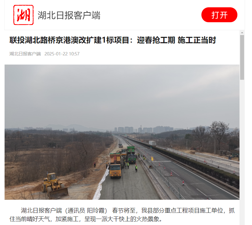 1月22日,湖北日報報道了聯(lián)投湖北路橋京港澳改擴(kuò)建1標(biāo)搶抓晴好天氣,大干快上的火熱景象,以下是報道全文: