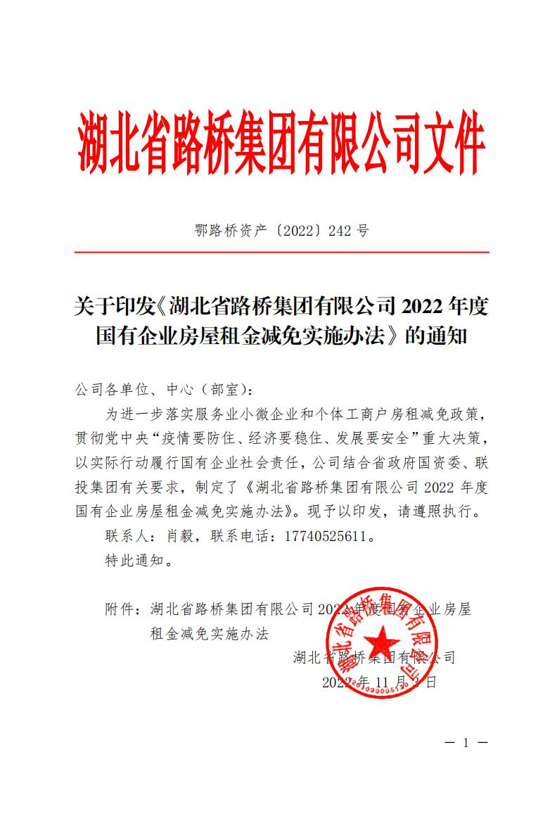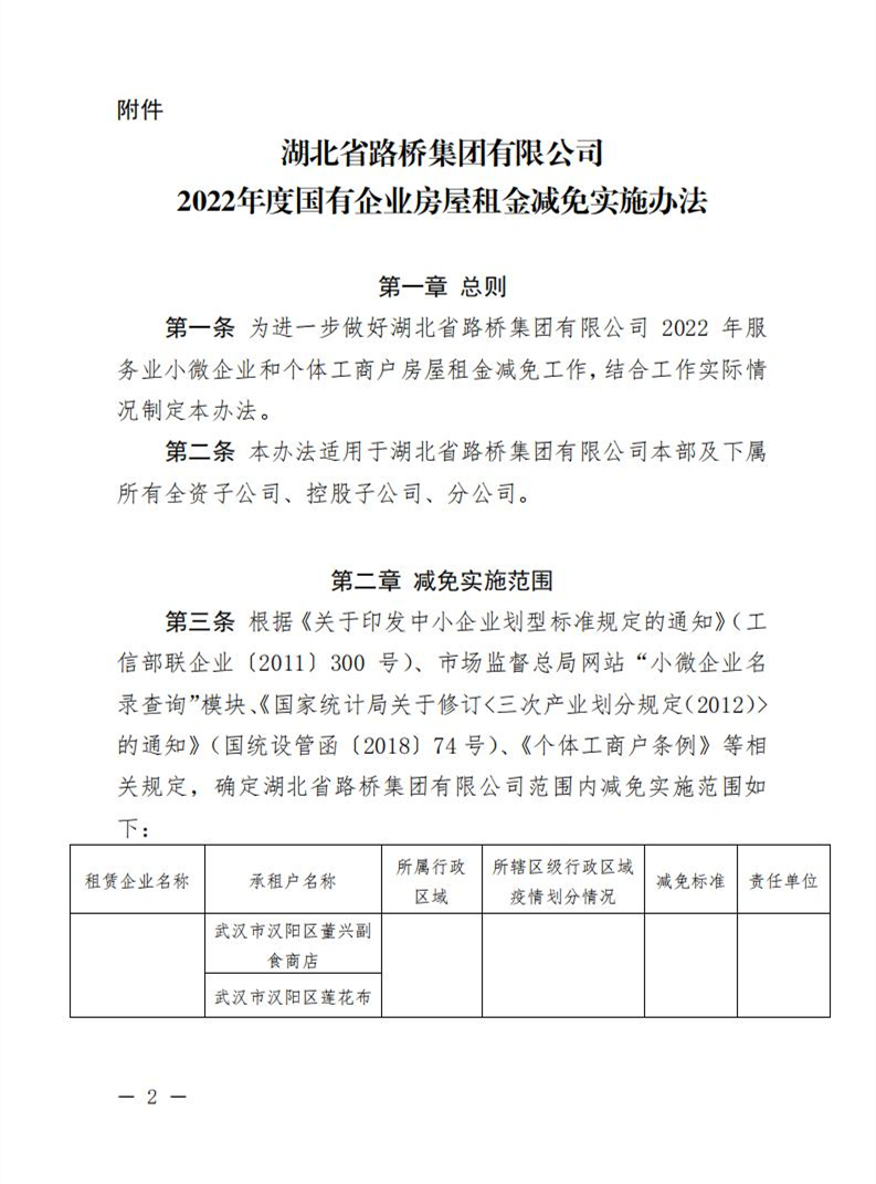 關于印發(fā)《湖北省路橋集團有限公司2022年度國有企業(yè)房屋租金減免實施辦法》的通知
